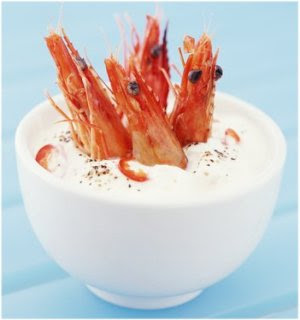 Coza os camarões em água temperada com sal durante 10 minutos. Entretanto, coloque na picadora/trituradora, a cebola cortada em quartos, o açúcar, o vinagre, o azeite, o leite e os pickles.